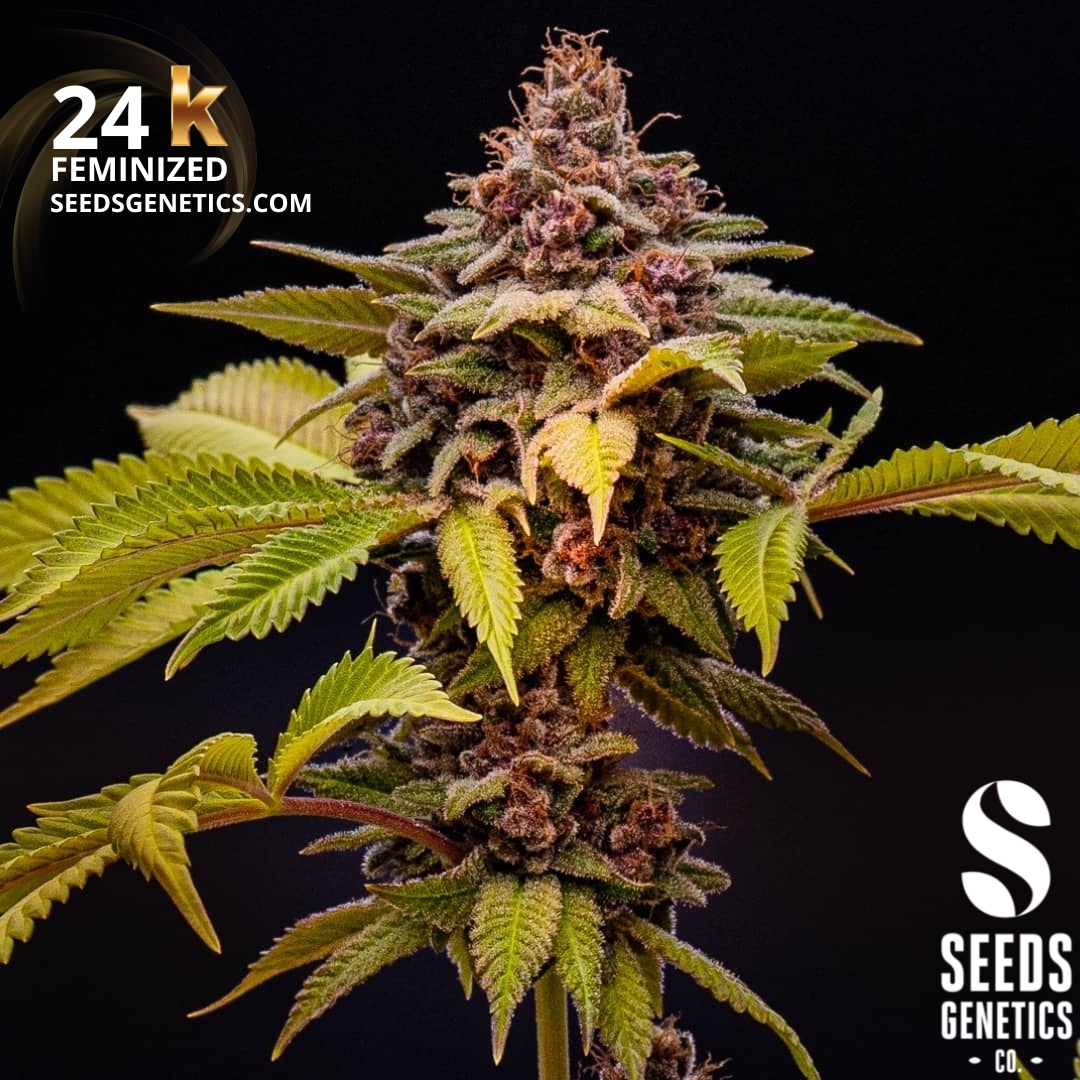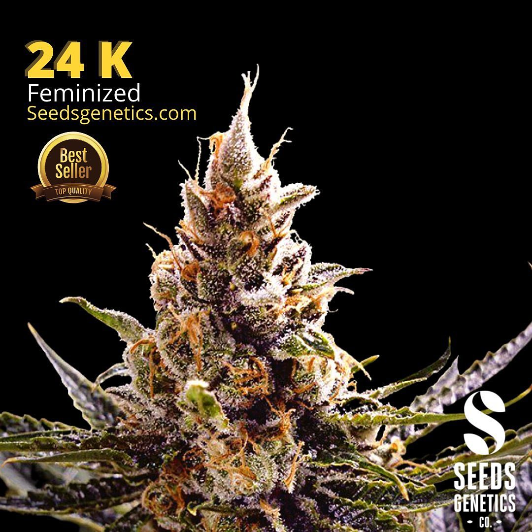 The plants deliver beautiful colors of dark green, orange-brown and purple hues. The genetics of 24K Gold are 60% indica and 40% sativa. 24K Gold has a flowering time of 9-10 weeks and can yield an average of 550g/m². Smoking this cannabis has a wonderful earthy taste with undertones of mandarin.