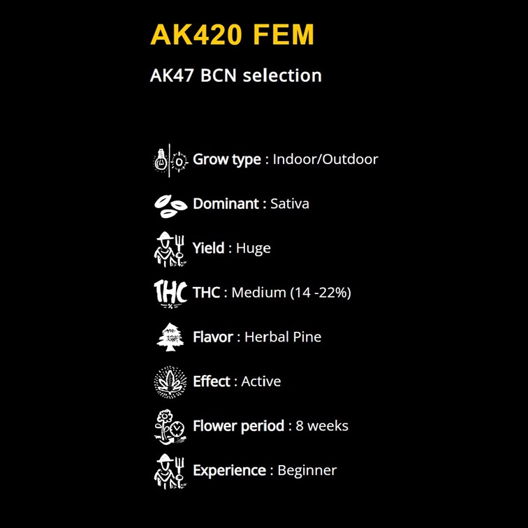 AK420 is incredibly easy to grow, making it the perfect choice for beginners and seasoned cultivators alike. With robust and resilient growth, it thrives in nearly any environment and delivers consistently high yields of fat, sticky buds that glisten with resin.